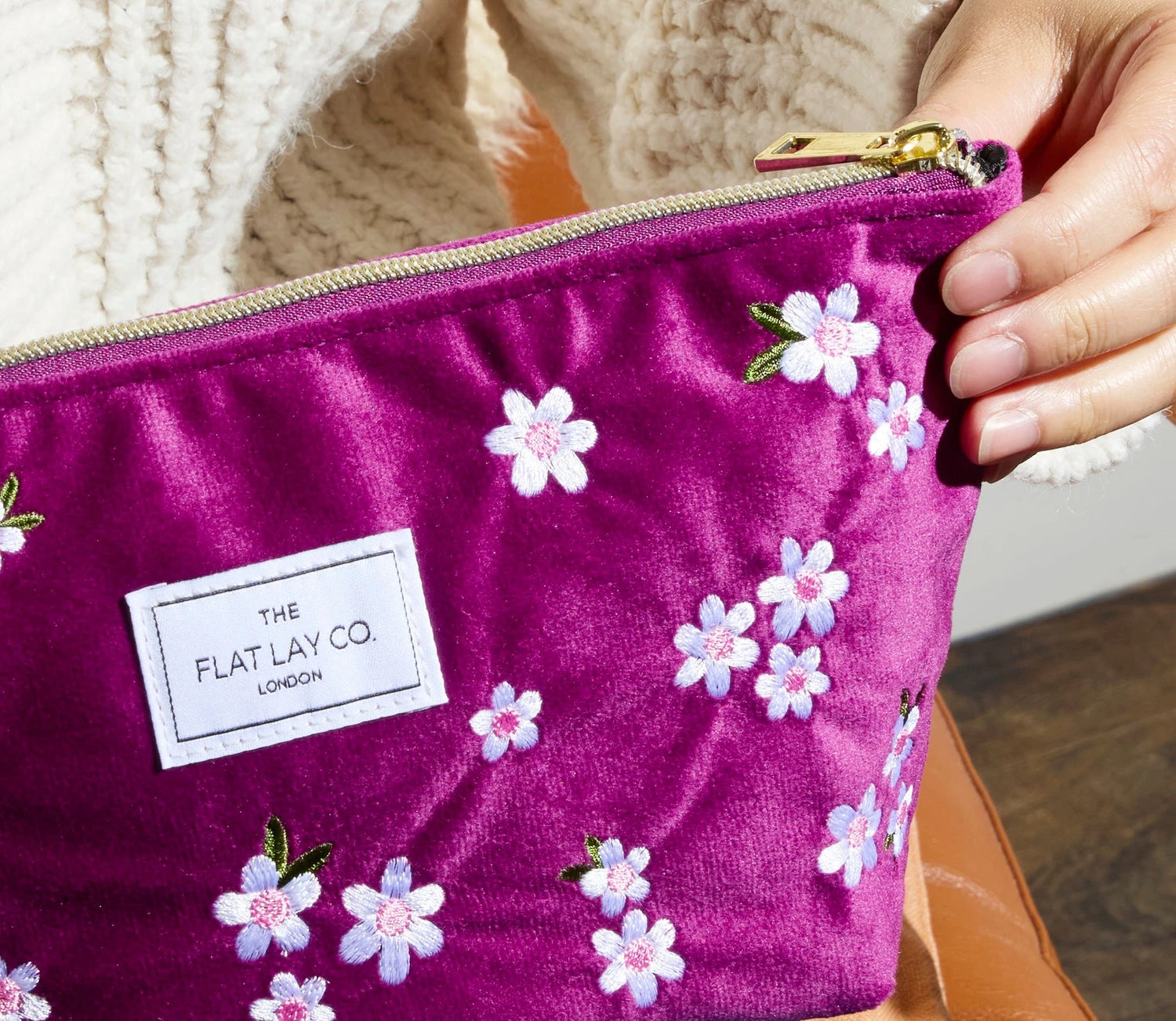 Essential Makeup Pouch - Ditsy Roses Burgundy Embroidered Velvet