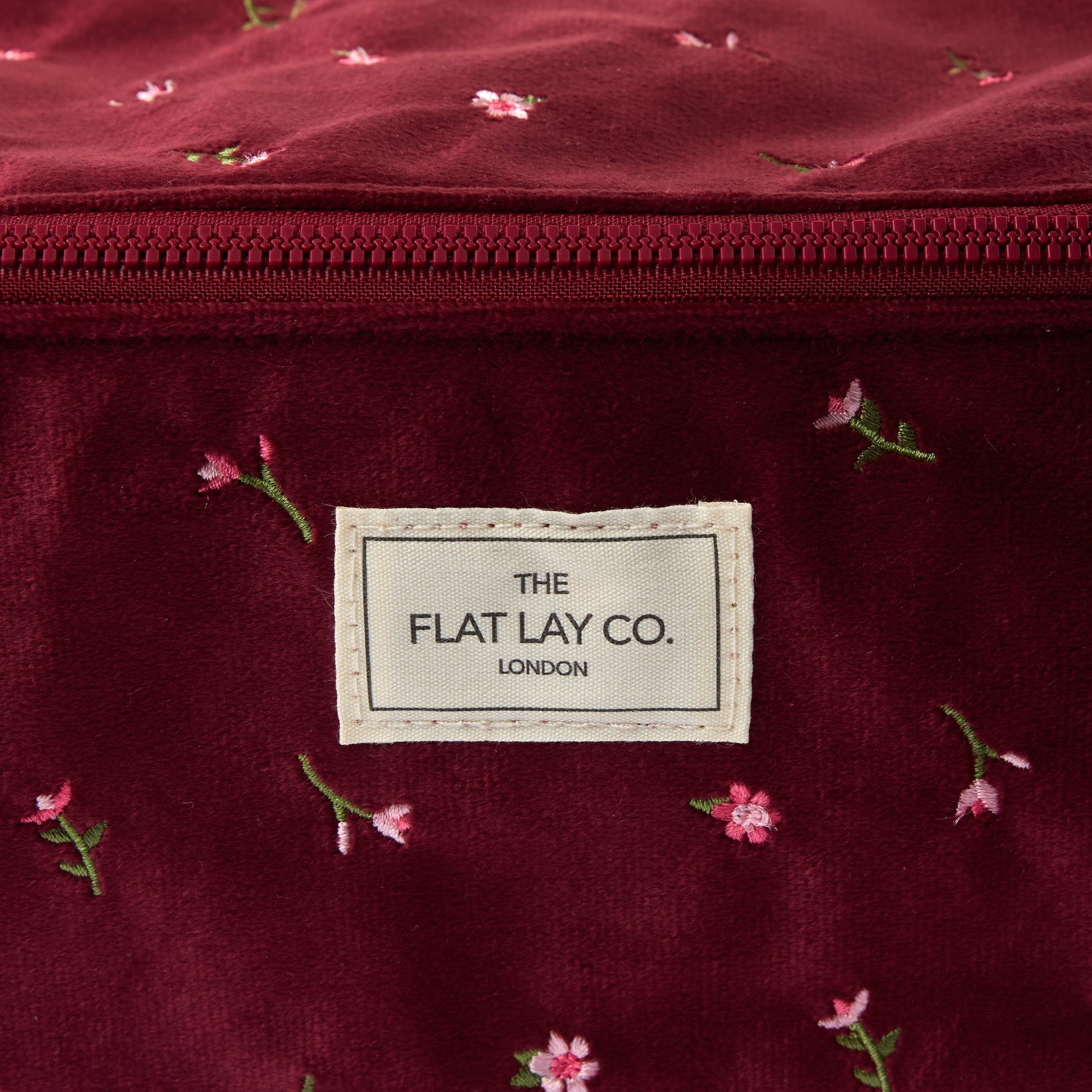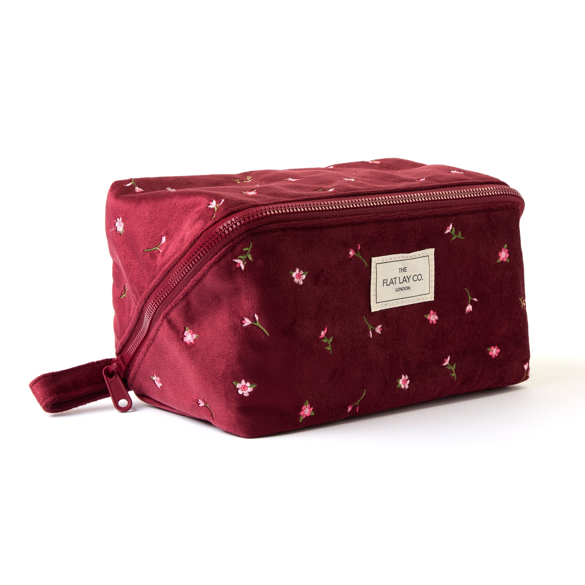 Flat Lay Makeup Box Bag - Ditsy Roses Burgundy Embroidered Velvet