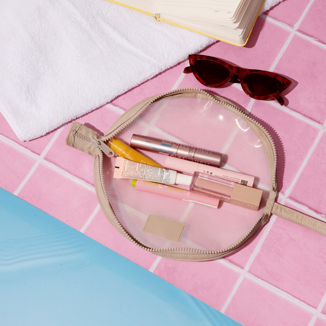 Unzip our Lunar Pouch and watch it transform from a sleek "half-moon" into a fully flat "full moon" makeup mat, giving you a complete view of all your cosmetics at once. Crafted from splash-proof, transparent material, this versatile pouch is the perfect summer companion. Whether tucked into your handbag or carried solo with the convenient wrist handle, it's designed to keep your beauty essentials organized and within reach wherever you go.